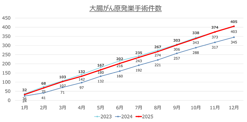 - ・手術数:大腸がん 405件、直腸がん 182件
