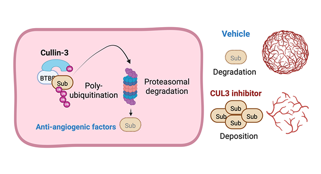 特に、Cullin-3をはじめとするE3ユビキチンリガーゼが、血管新生抑制因子の分解を介して血管新生を正に制御することを見出しています。現在は「血管新生抑制タンパク質の細胞内半減期制御による血管新生制御」をコンセプトに、次世代抗血管新生治療の開発を進めています。また、分解制御機構の操作による腫瘍血管正常化を通じて、がん進展抑制および治療効果向上を目指した新たな治療概念の確立にも取り組んでいます。さらに、細胞特異的かつ時期特異的なユビキチン修飾ダイナミクスを生体内で解析可能な遺伝子改変マウスを樹立しており、がんをはじめとするユビキチン修飾制御異常に起因する疾患の包括的理解を推進しています。