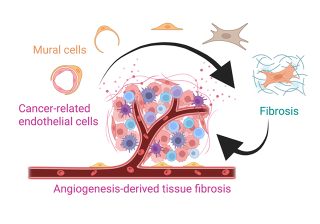 固形腫瘍においては、がん関連線維芽細胞や血管周皮細胞によって形成される腫瘍間質が、薬剤耐性やがん進展に深く関与することが知られています。我々の研究室では、血管新生に依存したがん間質形成を標的とした新たながん治療法の樹立を目指して研究を進めています。